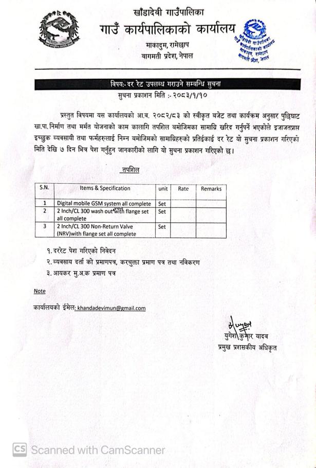 » दररेट उपलब्ध गराउने सम्बन्धी सूचना (पुछिघाट खानेपानी)