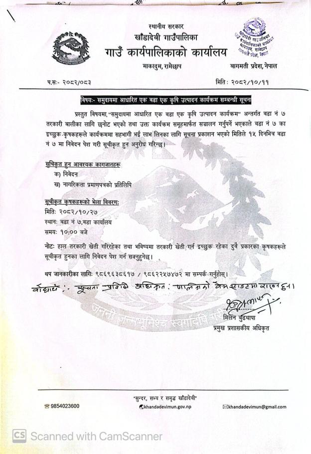 समुदायमा आधारित एक वडा एक कृषि उत्पादन कार्यक्रम सम्बन्धी सूचना !!